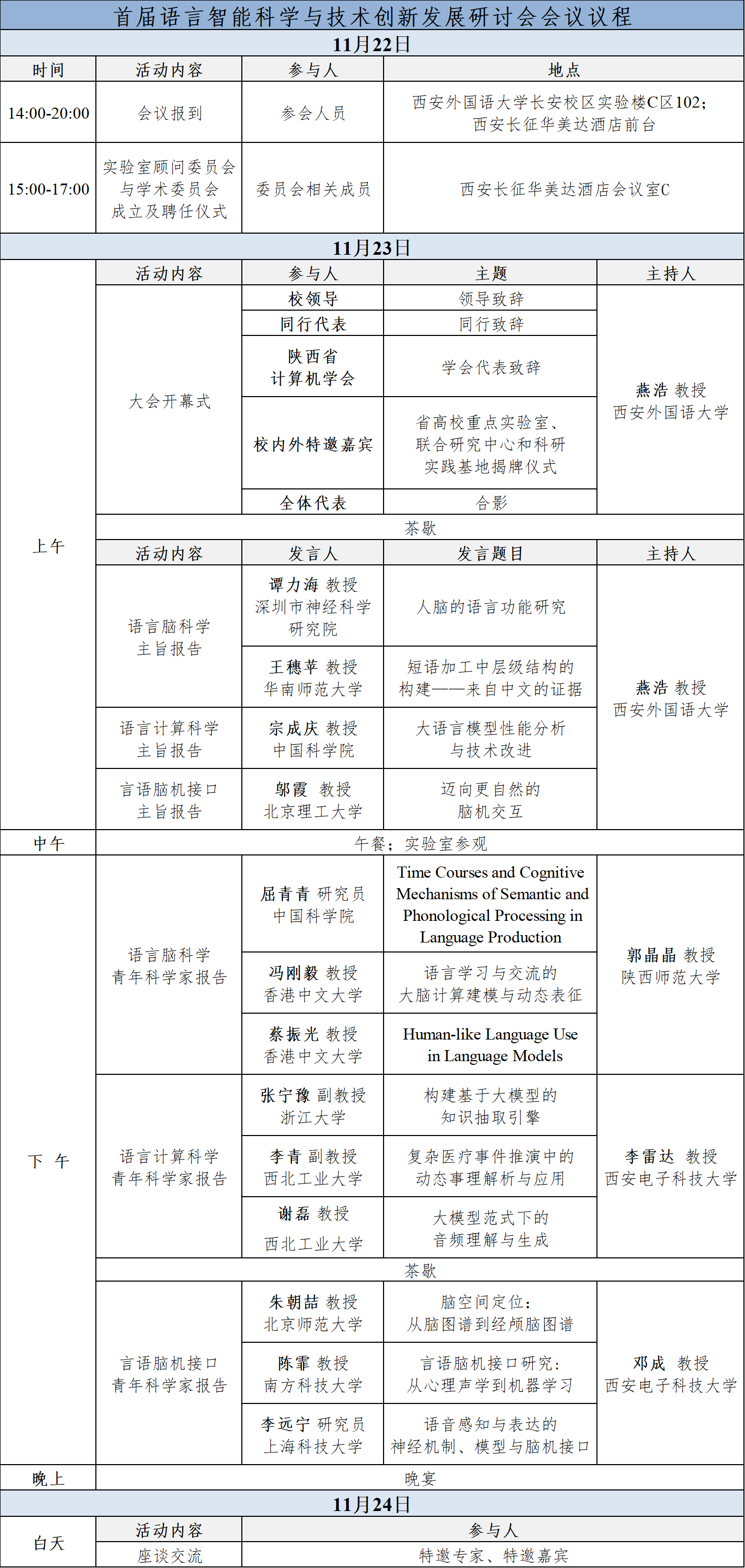 计划于2024年11月22日-24日在西外长安校区召开首届“语言智能科学与技术创新发展研讨会”。会议将邀请语言学、心理学、电子科学与技术和计算机科学等学科从事语言相关研究的知名学者,围绕语言智能科学与技术领域重大科学问题和技术创新展开探讨。现诚挚邀请对神经语言学、临床语言学、自然语言处理、脑机交互科学、教育信息科学等研究领域感兴趣的学界专家、科研人员、一线教师和博硕士研究生参加本次研讨!