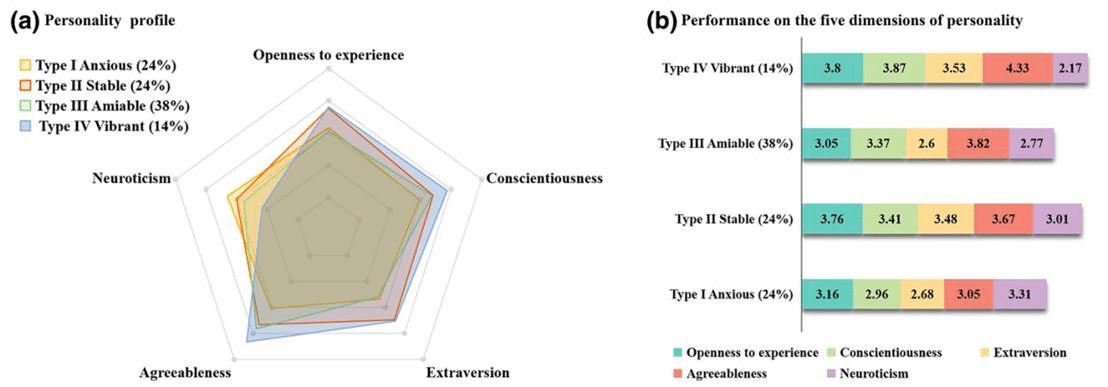 给理工科大学生画个像,看看不同性格(按“大五人格”分类)的人上网学语言有啥特点。在线语言学习特征可以从以下五方面描绘:策略、态度、动机、归因、自我效能感。而学生人格大致分四型:焦虑型、稳定型、随和型、活泼尽责型。猜谁最厉害?活泼尽责型夺冠!他们策略多、动力足、自信心爆棚。研究还顺手给了教学妙招:把活泼的和焦虑的同学组队,就能互相带飞!