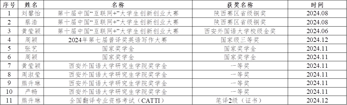 研究生学院一等奖奖学金;1名研究生通过了全国翻译专业资格考试(CATTI),获得了笔译2级证书。