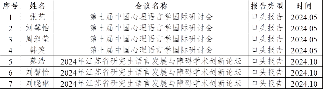 2024年,7名研究生受邀分别在第七届中国心理语言学国际研讨会和2024年江苏省研究生语言发展与障碍学术创新论坛中进行了口头报告,分享了实验室在语言脑科学、心理语言学、语言发展及言语障碍等领域的创新研究。