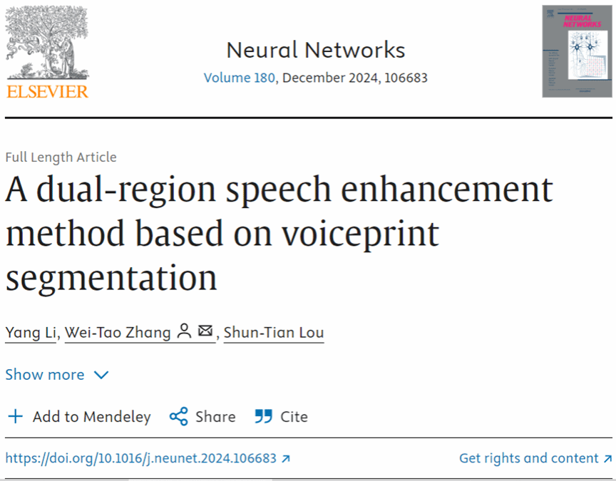李扬联合西安电子科技大学电子工程学院张伟涛/楼顺天教授在Neural Networks期刊上发表了题为“A dual-region speech enhancement method based on voiceprint segmentation”的研究论文。
