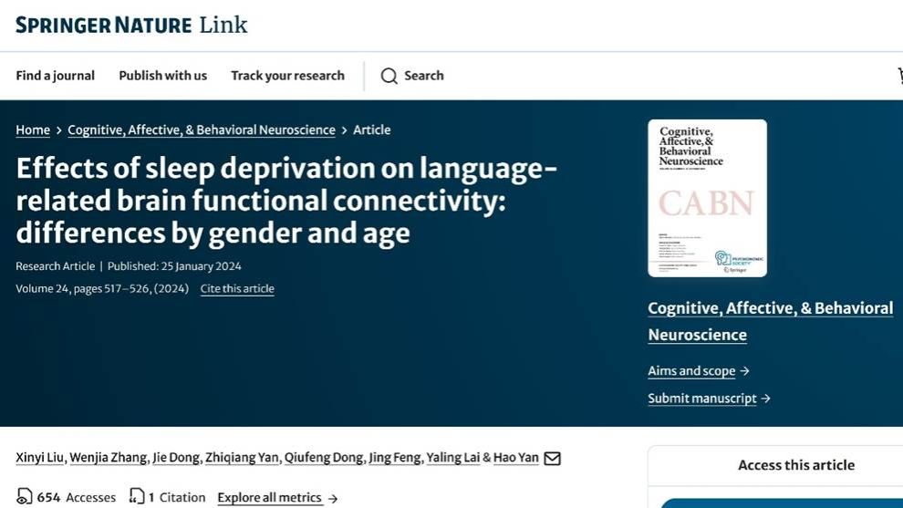 2024年1月25日,刘馨怡博士研究生在Cognitive, Affective, & Behavioral Neuroscience期刊上发表了题为“Effects of sleep deprivation on language-related brain functional connectivity: Differences by gender and age” 的研究论文。