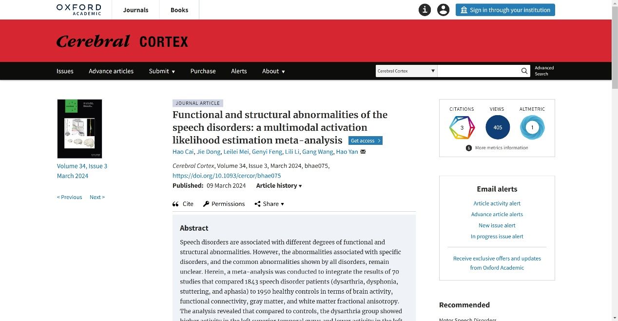 2024年3月,蔡浩博士研究生在Cerebral Cortex期刊上发表了题为“Functional and structural abnormalities of the speech disorders: A multimodal activation likelihood estimation meta-analysis” 的研究论文。