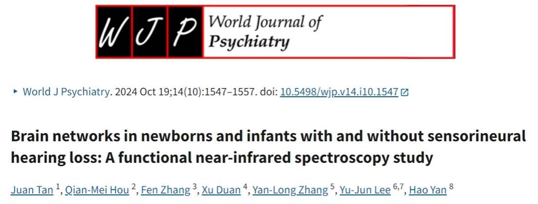 研究团队在World Journal of Psychiatry上发表了题为“Brain networks in newborns and infants with and without sensorineural hearing loss: A functional near-infrared spectroscopy study”的研究论文。