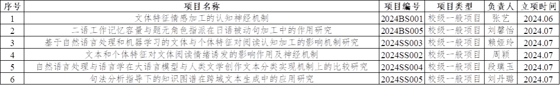 此外,实验室6名研究生还在学术项目上取得了显著进展,成功申报并获批了6个校级一般项目,涵盖了文体特征加工、二语习得研究、自然语言处理等领域。