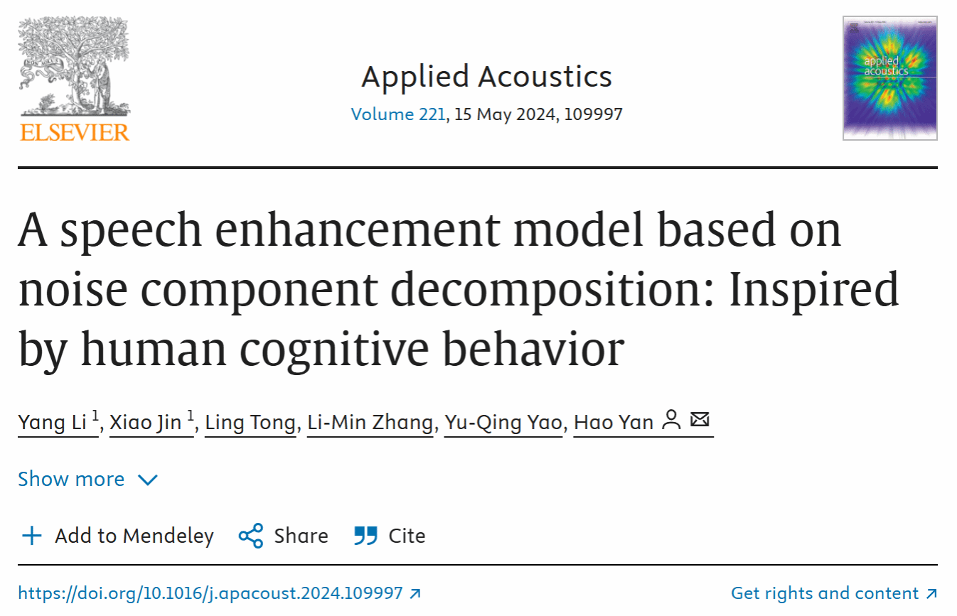 李扬团队在Applied Acoustics期刊上发表了题为 “A speech enhancement model based on noise component decomposition: Inspired by human cognitive behavior” 的研究论文。
