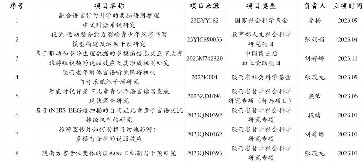 研究团队聚焦语言脑科学、语言脑工程、语言脑健康领域重点问题,积极申报各类纵向课题,获批国家社会科学基金项目、教育部人文社科基金、中国博士后科学基金会项目、陕西省社会科学基金项目、陕西省哲学社会科学研究专项(智库项目)、陕西省哲学社会科学研究专项8项。