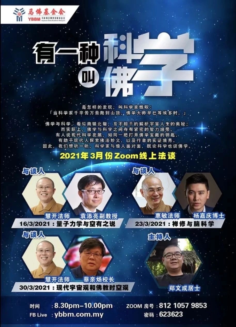 讲座简介:佛学与科学,看似南辅北辙,互不相干,而实际上,佛学与科学之间存有紧密的智力纽带。有人说现代科学发展如同一把打开佛学宝藏的钥匙,有助于现代人探索佛法妙义,以及行者的实证境界。因此,我们不妨听一听,科学家与僧人的面对面,既论科学也谈佛学。