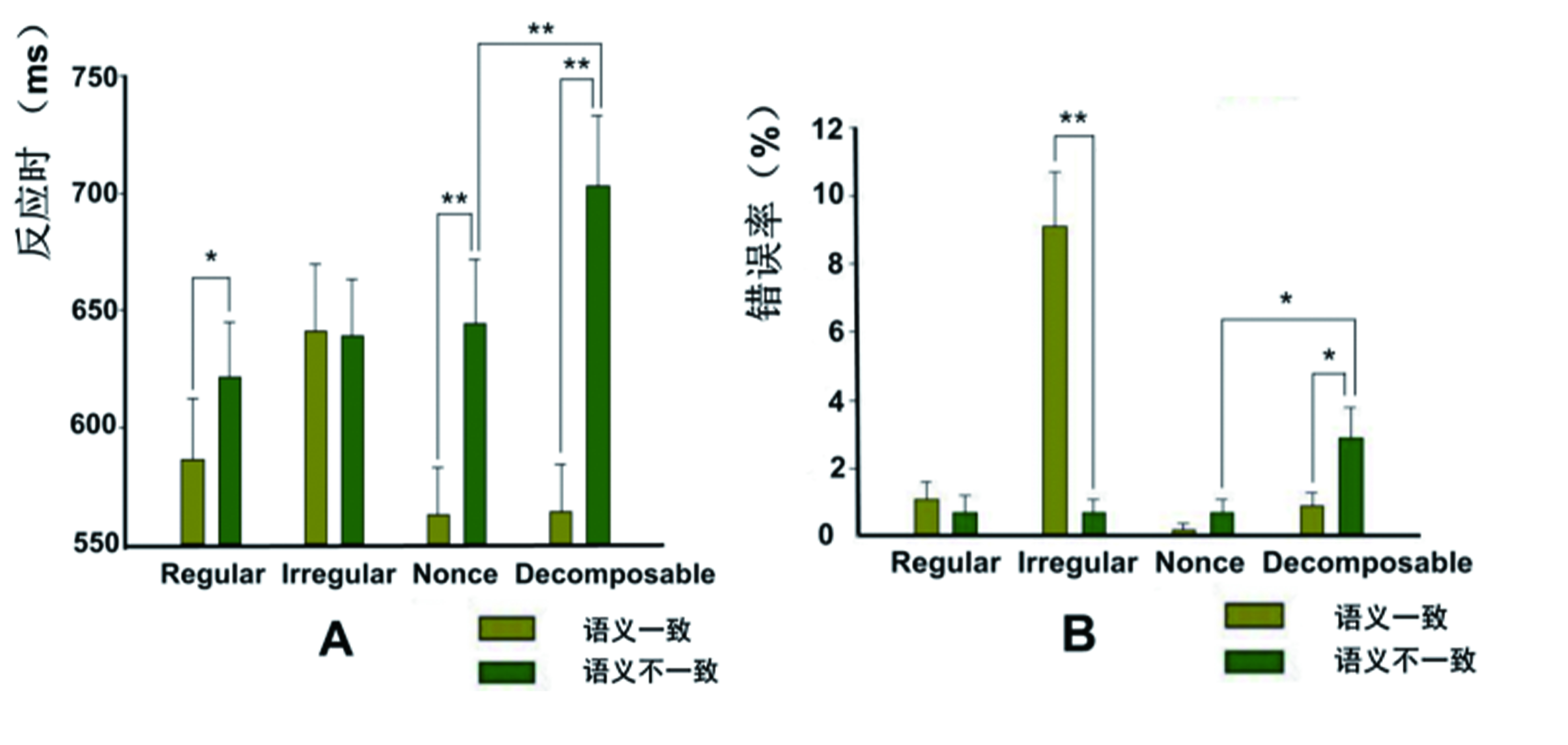 我们对被试的反应时和错误率进行了重复测量的2×4方差分析。启动效应分析结果如(图1)所示。进一步分析可以看出,规则动词的过去时态形式对其词根的识别有显著的启动效应[t(14)=2.27,p<.05;MD=34.97ms,SD=59.70ms]。而语义相同的不规则变化动词过去式对其动词原形的识别则没有表现出任何启动效应[t(14)= .139, p= .89; MD= 2.01, SD= 55.76]。被试在识别不规则动词过去式词对时的错误率最高(Mean= 4.01%,SD=5.16%)。可分解单词对嵌套词的语义抑制效应与语义一致条件下较高的错误率证明了正字法复杂词在识别中也是可被分解的。