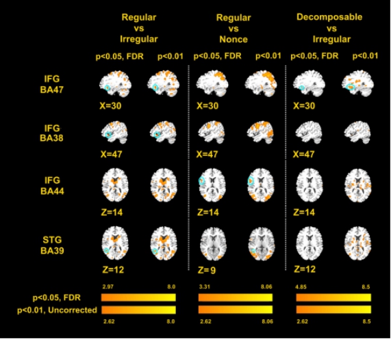将规则动词过去式,不规则动词过去式,以及控制条件进行两两比较后,发现传统语言相关脑区有较大范围的激活(图2)。规则变化动词和作为基线的控制组比较结果显示,外侧裂周区和皮层下区域(the perisylvian and the subcotical areas)都有激活。显著激活的区域集中在双侧额下回的岛盖部分(the pars opercularis, Brodmann 44)以及左侧额下回的三角部(the left posterior triangularis, Brodmann 45)。不规则动词和基线条件的比较结果没有发现任何显著激活差异。