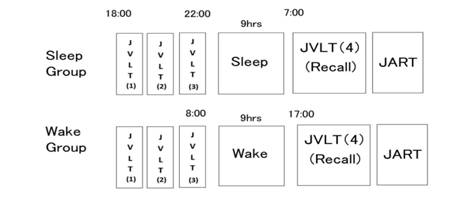 图2. 实验过程:睡眠组在开始睡觉前接受了连续三次的日语词汇学习测试。在第二天的早上,被试被要求在单词不出现的情况下,回忆尽可能多的单词。清醒组也进行着同样的实验过程。