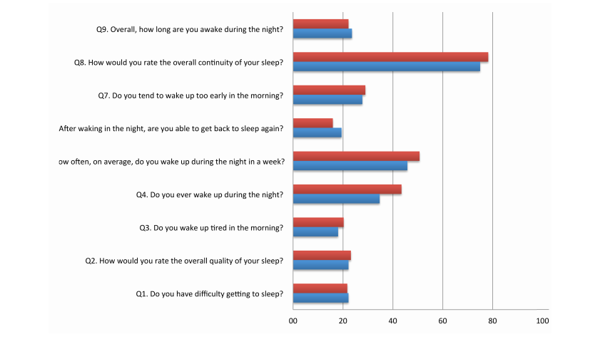 实验采用阿尔茨海默病患者的睡眠连续性量表(SCADS),所有被试的睡眠活动都在临床评估下进行。量表包括9个问题,涉及睡眠时长和睡眠质量、夜醒次数和入睡困难等,每个问题有4个选项供被试选择,用来描述他们的睡眠情况(选项从1分到4分,1分为无问题,4分为非常糟糕)。与以往的调查研究相比,该量表通过9个不同问题,对被试的睡眠行为进行了更全面的了解考察。测试完成后,研究者整合了人群神经心理学测试的得分表现,并对样本进行分析,考察完成个体神经心理测试表现与不良睡眠之间的关系的调查。图1为SCADS量表,包括9个问题,涉及睡眠时长和睡眠质量、夜醒次数和入睡困难等。