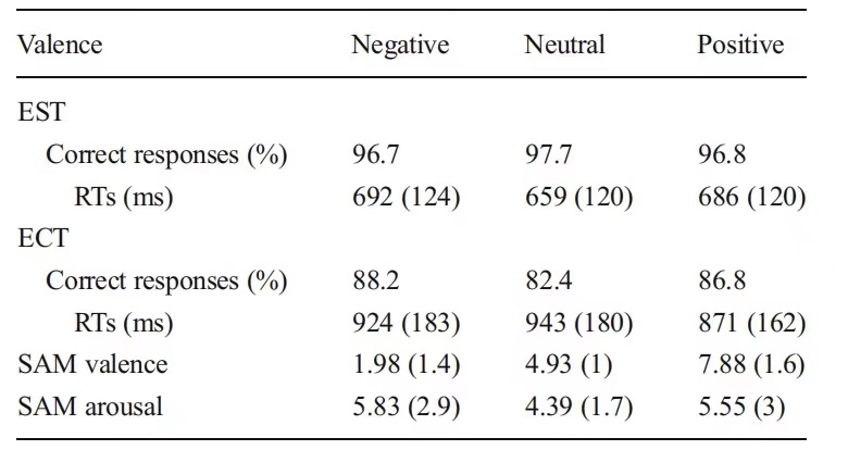 图3. 两任务的正确率和反应时,和每个情绪分类的SAM效价和唤醒度的平均率