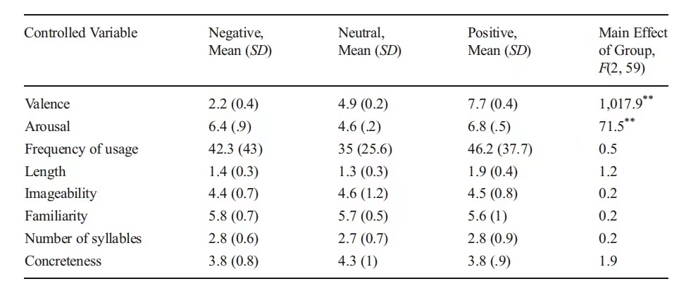 情绪分类任务:随机呈现了以三种颜色印刷的60个单词,被试以相同的顺序进行了180次试验。 要求参与者按下一个按钮(分别为肯定,中立和否定的内容标记为“ +”,“ 0”和“-”)以对单词的情感效价进行分类。为确保被试了解任务的要求,要求他们在每项任务之前完成十次训练试验。被试使用惯用手完成任务。
