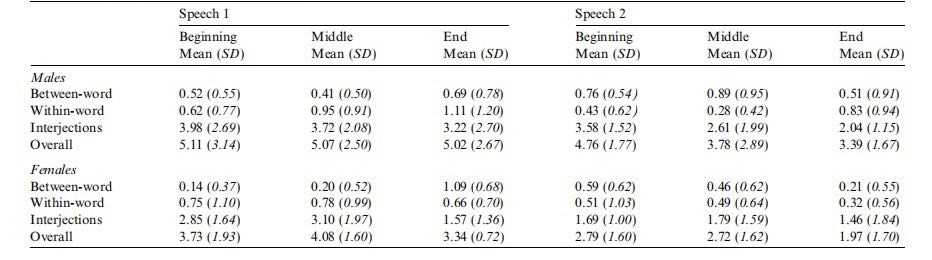表2 两次演讲的不流利平均百分比数据(数据包括具有词间不流利,词内不流利和感叹词的音节百分比,以及整体不流利百分比(总体))