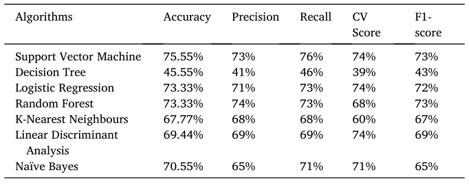 本研究收集了某在线课程的498个学生样本并对数据进行了预处理。研究采用决策树、支持向量机、邻近分类算法、朴素贝叶斯、线性判别分析、随机森林算法和逻辑回归等多种分类算法进行数据分析,结果如下: