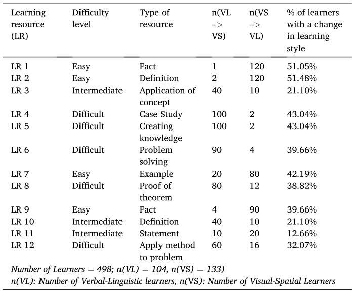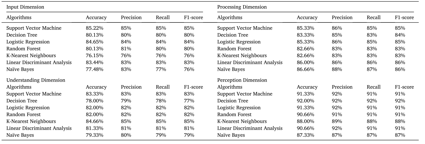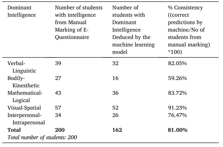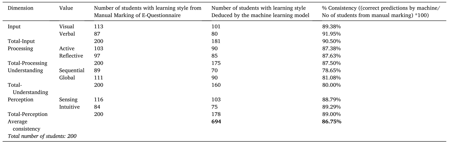 本研究试图检测多元智能模型指标与费尔德-西尔弗曼模型的指标,其中部分属性为通过音频学习所花费的时间、发送的消息数等。通过收集数据,运行算法验证来机器预测分类的准确性。在检测学习者主导智力类型方面,支持向量机算法的精度最高,决策树算法最低。在针对FSLM模型收集的数据中,本研究计算了不同算法的每个维度的精度,其中在输入维度,支持向量机的精度最高。研究还观察了不同学习风格模式,例如根据环境变化(如临近考试日期)学习者的学习风格的改变、根据概念难度学习风格改变。