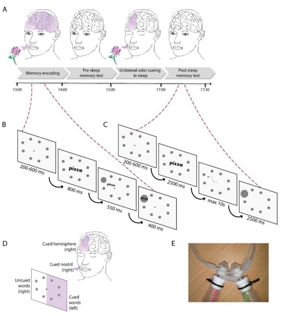 该实验总共分为4个阶段。第一阶段是记忆任务。已证实个体的左右脑在记忆工作中发挥着不同的作用。研究人员在部分单词出现时让被试闻到玫瑰的香味(odor cue),并要求被试判别要记忆的单词出现在电脑屏幕的方位(左或右)。在完成记忆任务后,进行第二阶段——睡前测试,即测试被试对单词位置的记忆。第三阶段为睡眠中的气味传输,这一阶段要求被试在实验室进行1-1.5小时的短时睡眠活动,同时实验人员对被试进行脑电监测,在这一段时间里,研究人员将玫瑰的气味输送进被试的一侧鼻孔中,通过单侧气味刺激,能够起到重新激活并且增强储存在特定大脑半球的特定记忆的作用。最后是第四阶段——睡后记忆测试阶段,任务是在被试结束睡眠后,对其进行睡后记忆测试。