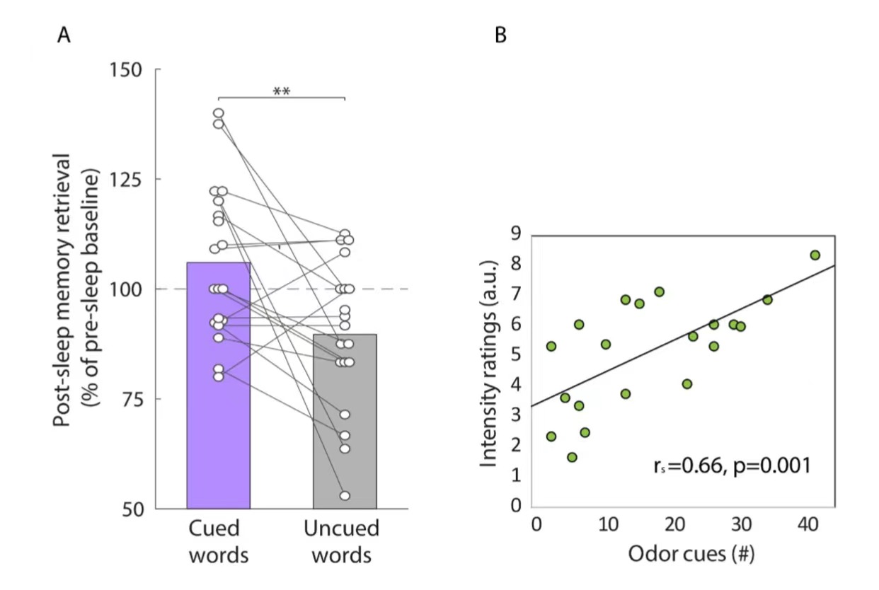 研究人员在唤醒被试后对其进行的第二次单词记忆测试,测试内容为被试入睡前接触过的单词。在记忆行为实验检测的结果中,研究人员发现,被试对于受到气味提示(odor cue)一侧的大脑半球的单词记忆明显较好。