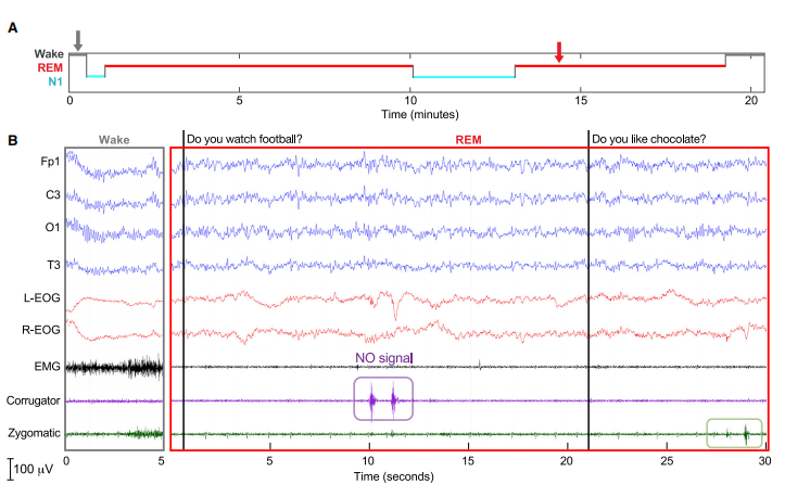 第三位被试20岁,来自法国,有嗜睡症并可以轻易地进入清醒梦状态。在他发出进入清醒梦状态的眼动信号后,实验人员口头问他“是或不是”的问题,他通过面部肌肉收缩做出了正确的回答(颧肌回答“是”,皱眉肌回答“否”),如图4所示。