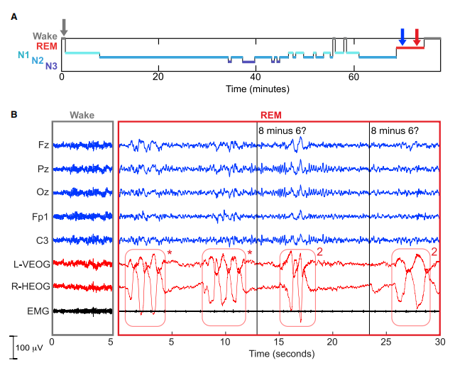 第一位被试19岁,来自美国,仅有过两次清醒梦经历。在进入快速眼动睡眠期间后,实验人员首先通过眼电图(EOG)观察到被试给出了连续三次的左右眼动信号(LRLRLR),这表明被试已经进入清醒梦状态。实验人员接着会通过给他一个听觉刺激,提问一个简单的数学问题:“8−6”。被试会在3秒内通过两次左右眼动信号(LRLR)来表示正确答案是2。该数学问题被再次重复以后受试者仍能做出正确回答,如图2所示。