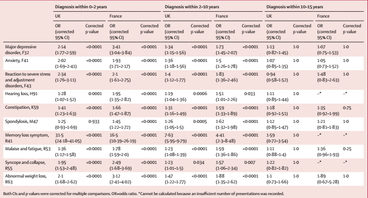 针对阿尔茨海默病确诊前2年、2-10年和10-15年三个阶段,本文作者对123种可能的症状进行了匿名测试。在2-10年的前驱期内,经过Bonferroni校正后,在两国患者的123种症状中,有10种(8%)与阿尔茨海默病的诊断呈现显著正相关(表2;图1),即早期症状可能包括重度抑郁症、焦虑、有严重压力且出现适应障碍、听力损失、便秘、脊椎病、体重异常减轻、不适和疲劳、记忆力减退、晕厥和虚脱。