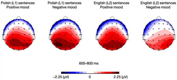 图8 波兰语(L1)和英语(L2)句子在600-800ms时间窗口内正性和负性情绪条件下ERP幅度差异的地形分布