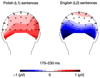 图2 波兰语(L1)和英语(L2)句子在170‑230ms时间窗口内正性和负性情绪条件下ERP幅度差异的地形分布