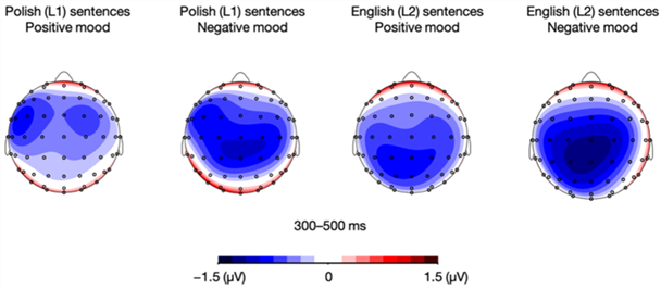 图6 波兰语(L1)和英语(L2)句子在300-500ms时间窗口内正性和负性情绪条件下ERP幅度差异的地形分布