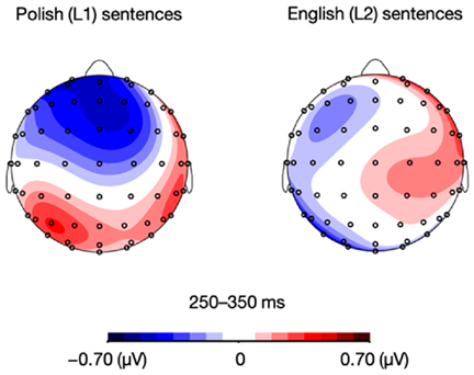 图4 波兰语(L1)和英语(L2)句子在250-350ms时间窗口内正性和负性情绪条件下ERP幅度差异的地形分布