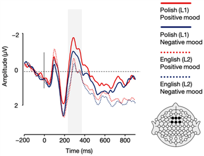 对N2时间窗口进行重复测量方差分析,结果显示:①句子类型的主效应:无意义的句子诱发了更大的N2波幅。②语言的主效应:波兰语(L1)句子诱发了更大的N2波幅。③情绪的主效应:与负性情绪状态相比,正性情绪状态诱发了更大的N2波幅。如图4、图5所示。