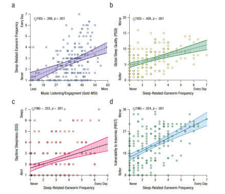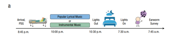 先了解一个有趣的现象——“耳虫”(earworm)效应,这是一种无意识音乐成像,即音乐在没有主动回忆的情况下进入脑海并在没有意识控制的情况下重复循环播放,通常在清醒时发生。研究人员相信,经历“耳虫”效应的人更难入睡,夜间醒来的次数更多,在浅睡眠阶段花费的时间更长。