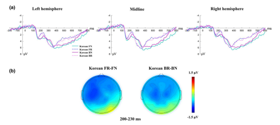 N170成分:在向前书写条件下,目标汉字诱发的负性N170成分比在向后书写条件下更偏向左侧,左侧顶上小叶可能是这一效应的来源。其次,书写方向对韩文阅读的N170成分没有影响。