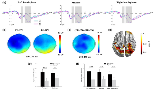 N400成分:汉字和韩文阅读中均检测到了重复和非重复条件下的N400效应,但这些效应不受书写方向的影响。