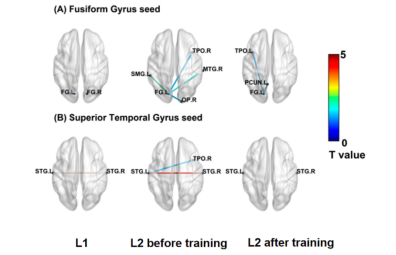 本研究通过分析数据探究了在L2训练后口语和书面语的神经网络是否发生了变化,变得与L1训练后的神经网络更相似或更不同。我们观察到,随着二语水平的提高,母语的书面和口语网络并没有被习得。为了进一步了解二语学习者阅读网络的发展,未来的研究可以考虑延长培训时间,提高学习质量,并纳入额外的评估措施,如语法和词汇水平,以更全面地评估二语能力。这将有助于更好地研究二语学习和神经网络变化之间的关系。