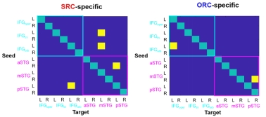 SRC特异性有效连接包括LIFG和LSTG间的交互。其中,LIFG到LSTG的有效连接有两条:LIFG tri / LIFG orb → LmSTG;LSTG到LIFG的有效连接有1条:LpSTG → LIFG orb。与之不同,ORC特异性有效连接不涉及LIFG和LSTG间的交互,而只包括IFG或STG内部的连接:LIFG orb → LIFG oper和RmSTG → RpSTG。