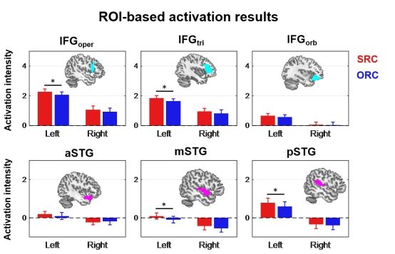 全脑分析结果表明SRC比ORC在左侧脑岛延伸至颞上回中后部(LmSTG/LpSTG)区域激活更强;ORC比SRC在右腹内侧前额叶(vmPFC)激活更强,vmPFC属于默认模式网络(DMN)中的经典区域,因而该结果支持ORC加工所需要的认知资源更低。ROI分析结果表明SRC在LIFG oper、LIFG tri、LmSTG、LpSTG的激活更相比ORC更强。