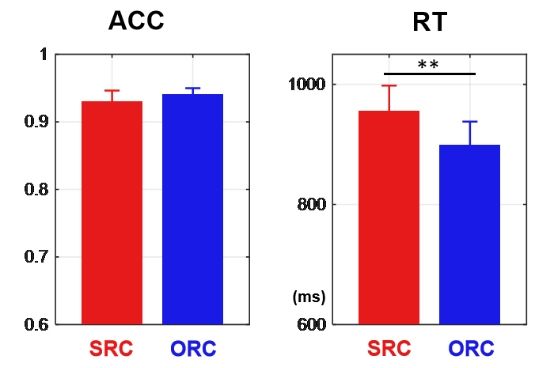 SRC的反应时(956.01ms)显著长于ORC(899.06ms),支持汉语ORC加工的认知负荷更低。二者的准确率无显著差异。